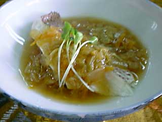 - ナベに分量の水と(2)の野菜を入れて煮立たせ、「材料B」の調味料をくわえ味をととのえ、水溶き片栗粉でとろみをつける。