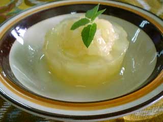 - (1)のナベを火からおろし、その中にリンゴジュースを加え、(2)の粉ゼラチンを加えてよくまぜたあと、型に入れて冷やし固める。(冷蔵庫で3〜4時間)