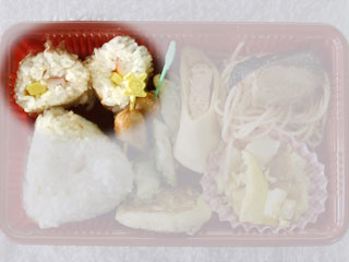 - 平たい皿におかかをのせ、(6)を転がしながらまんべんなくおかかをつけて出来上がり。