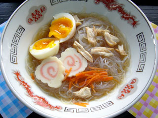 緑豆春雨 40 g ほたてだしの素 8 g 醤油 5 cc 鶏ささみ 2 g ステーキ醤油 3 cc 人参 2 g ゆで卵 1/2 個 ナルト巻 10 g