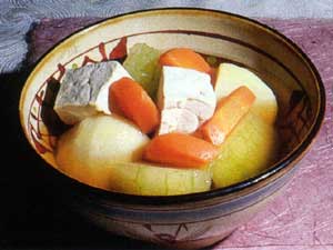 - かつお節でだし汁をとり、2.と合わせて冬瓜、人参、じゃがいもを煮て、火が通ったら豆腐を加え、塩、しょうゆ、酒で味をつけ最後にしょうが汁を加える。