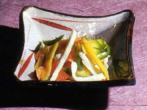 - 蒸しかまぼこ(白)は3cm長さのうすめの短冊切りにする。