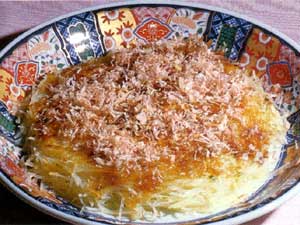 - 両面が焼けたらお好み焼きソースをぬり、花かつおをふって熱いうちにいただく。